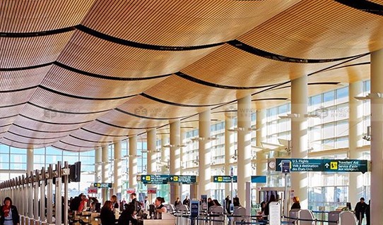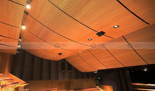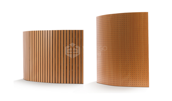 弧形天花以及弧形墻面板,最近越來越受設計師以及客戶的青睞,廣泛的應用于各種高端裝飾設計。我們運用密度板板材的特性,在槽孔以及孔木的基礎上,采用特別的工藝,衍生出弧形板。弧形板的槽孔結構以及通孔結構符合聲學原理,在中低頻吸聲上效果顯著。飾面的弧形結構,有一定程度的擴散效果,改善混響時間顯著,有效提高環境音質飽滿度、清晰度和立體感。另外,飾面的多樣性以及弧形的造型,不僅給客戶多樣化的選擇,也增強墻面天花裝飾的流暢感和立體感。