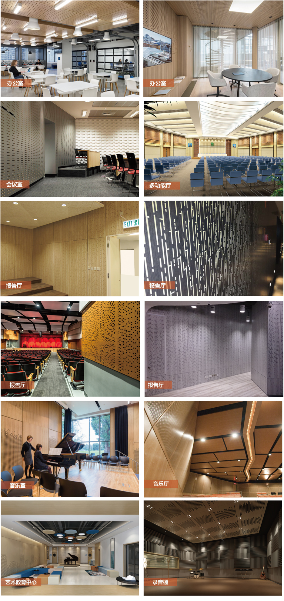 辦公室、多功能廳、會議室、報告廳、藝術中心、歌劇院、體育館、酒店、家庭影院等對聲學和藝術美學要求較高的場所。