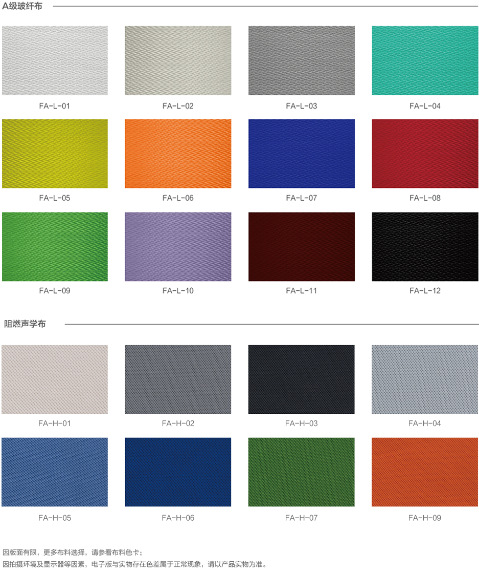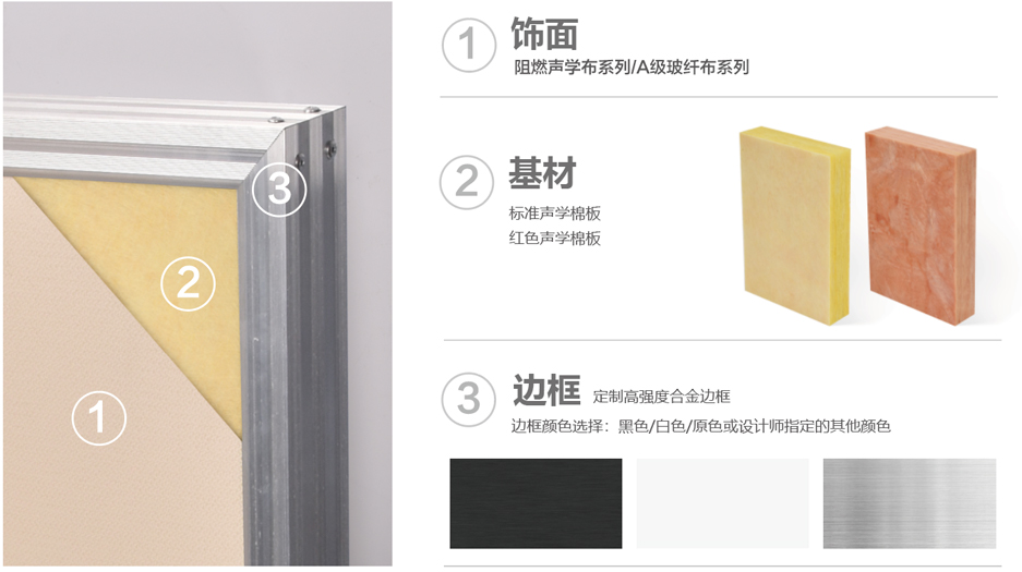 • 結(jié)構(gòu)定制高強(qiáng)度合金邊框,內(nèi)置全頻玻纖聲學(xué)棉板,棉的表面復(fù)合環(huán)保密閉 吸聲氈,表層包裹A級防火玻纖布或阻燃聲學(xué)布