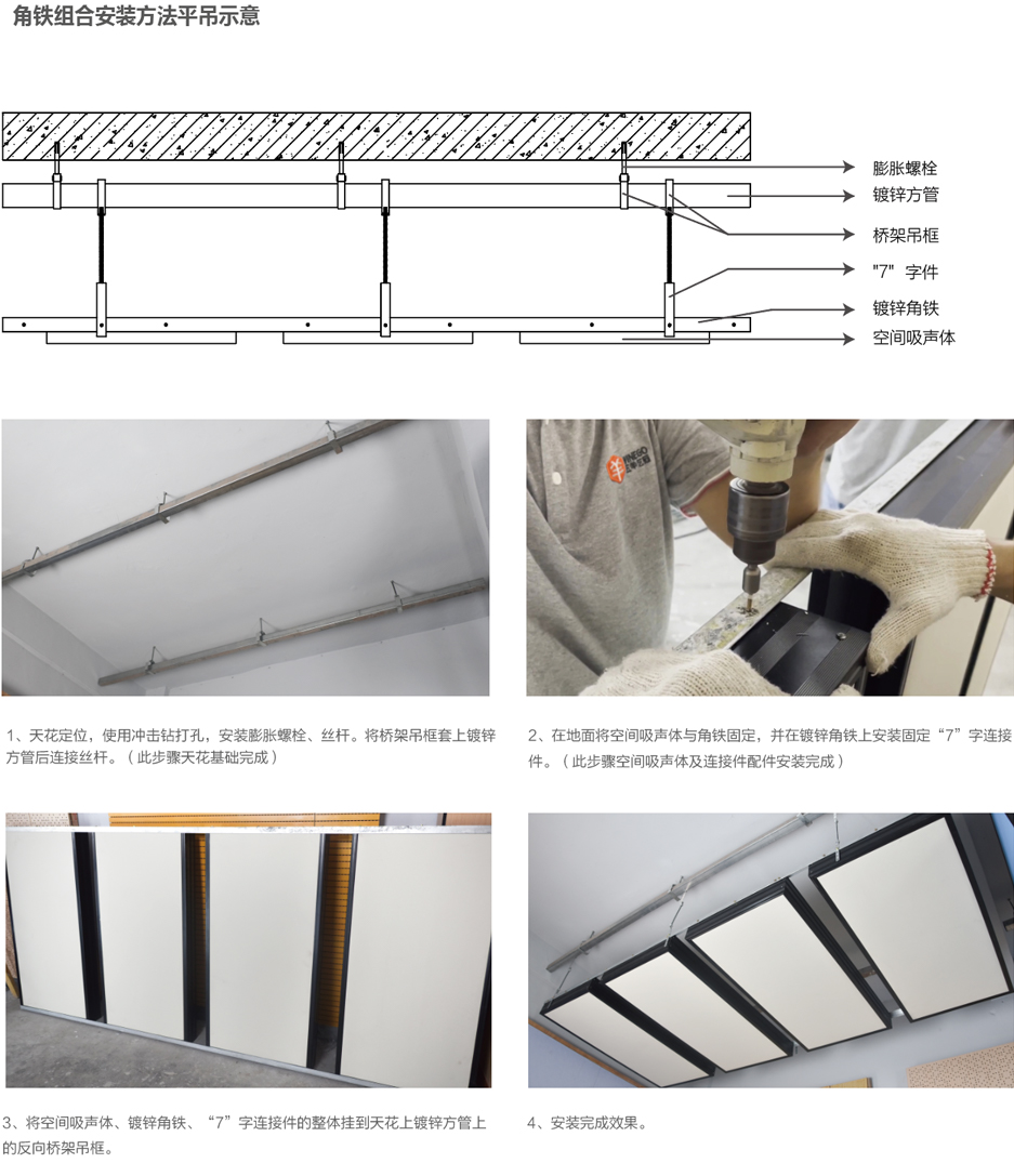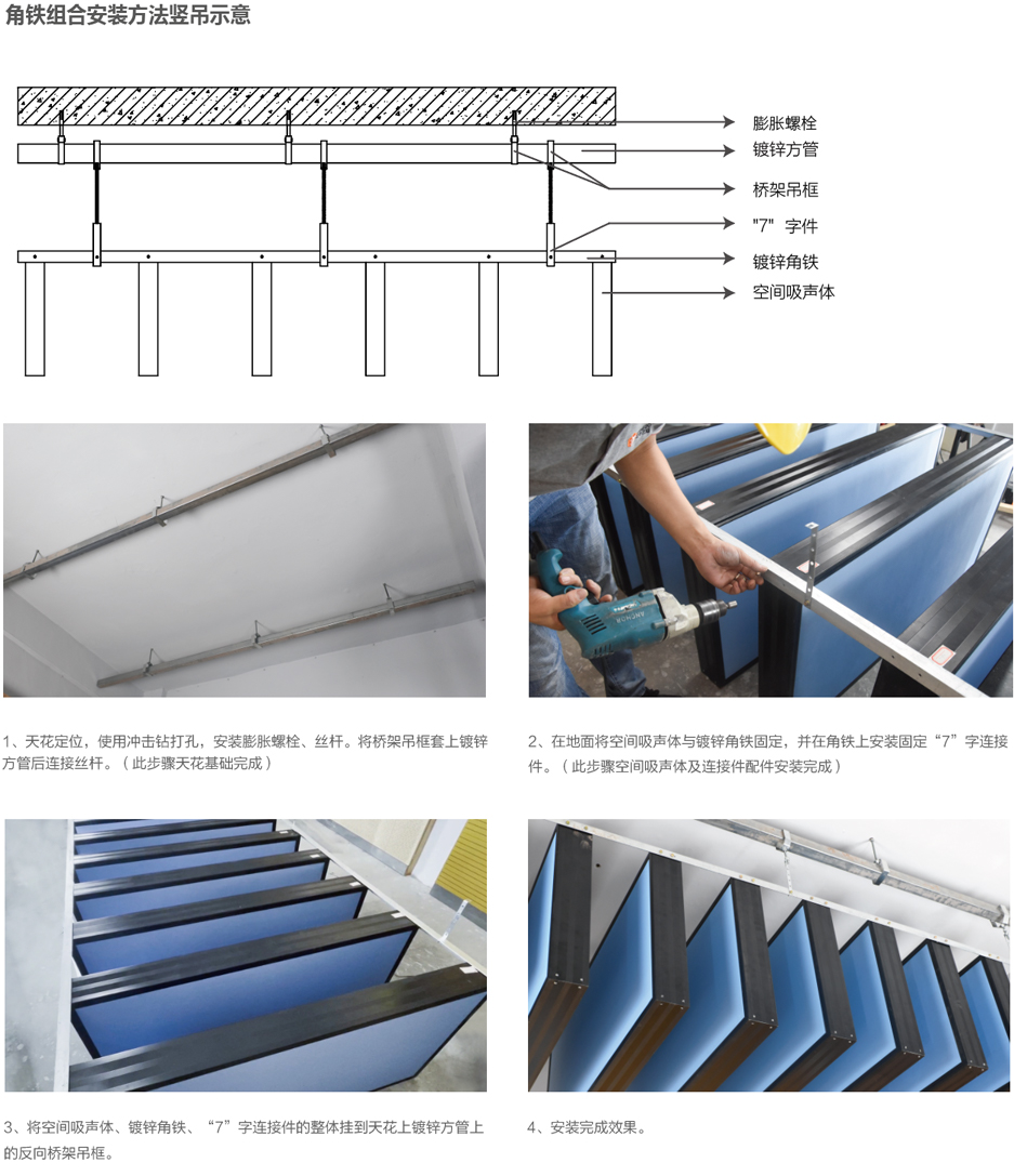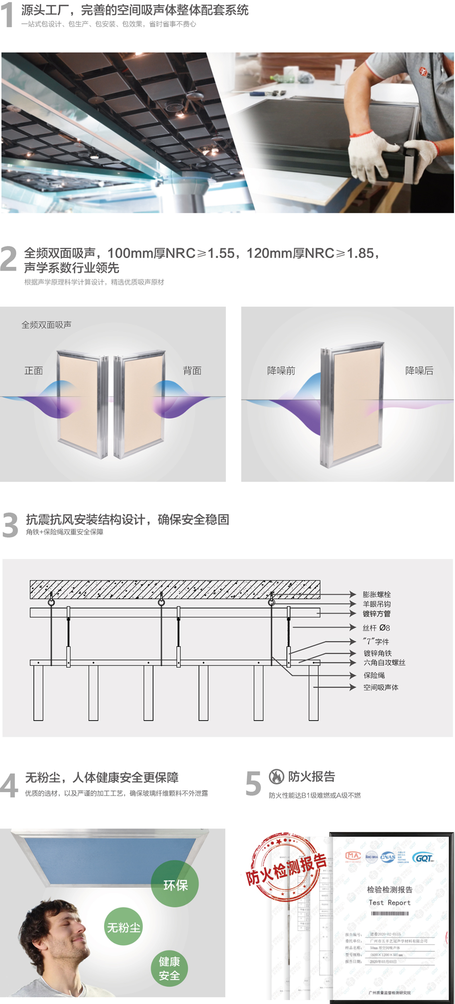 產(chǎn)品具有環(huán)保、防火、吸聲性能高、布置靈活、施工方便等特點(diǎn),能有效降低室內(nèi)混響時(shí)間,提高語言清晰度。