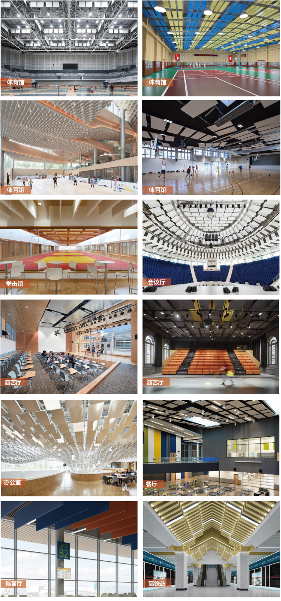各類體育場館、會展中心、廠房、演藝廳、多功能會議廳、候車室等需要強(qiáng)吸聲的場所。