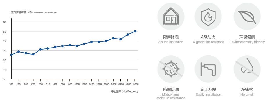 復合阻尼隔聲板IB07E 兩面分別采用不同厚度高密度無機材質,中間夾2mm高分子凈味環保阻尼層,高壓復合成三合一夾芯結構。兩面無機材質與中間阻尼膠形成阻尼約束,改變原材質的共振頻率,高效提升了原材質的空氣隔聲量和結構隔聲量,用于環保氣味要求非常高的場所。