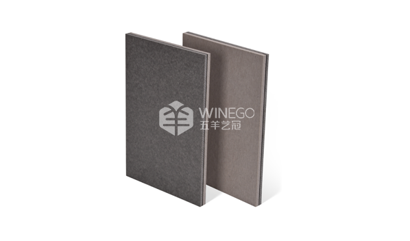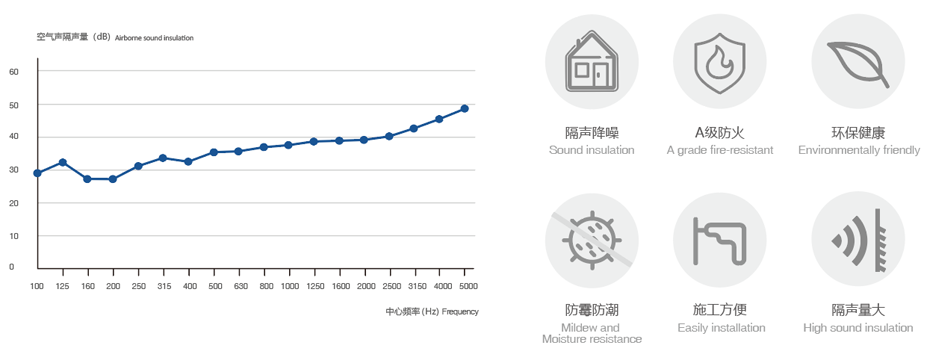 復合阻尼隔聲板IB08兩面分別采用不同材質、不同厚度和密度的無機材質,中間夾2mm高分子阻尼膠,高壓復合成三合一夾芯結構。兩種更高密度無機材質與中間阻尼膠形成阻尼約束,改變原材質的共振頻率,倍數提升了原材質的空氣隔聲量和結構隔聲量。
