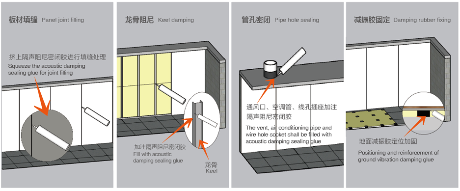 • 適用范圍1、隔聲板安裝接縫填充密閉; 2、安裝金屬龍骨與隔聲板時增加接觸面阻尼效果, 有效消除結構共振; 3、隔聲構造層電線管孔及空調通風管出口密閉, 以防空氣漏聲; 4、地面減振膠與隔聲板安裝鋪設時的位置固定。