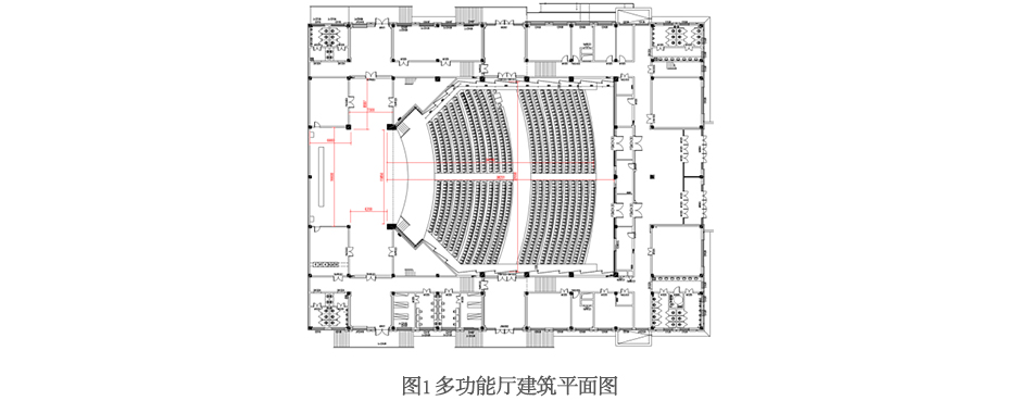 本方案以廣東省廣州市某學院的多功能廳聲學建設為例。該多功能廳主舞臺高度高達15m,一般設有數量很多的吊桿;舞臺面積較大,含主臺、側臺和后臺,整體呈品字型。