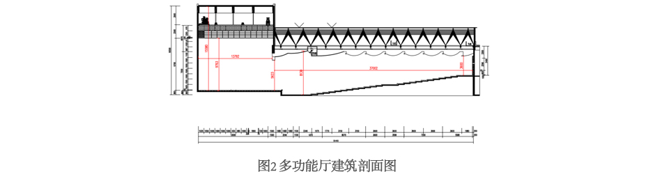 多功能廳觀眾廳平面呈鐘形,觀眾廳長37m,寬32m,最高點8.1m,最低點3.6m。舞臺面比第一排高0.8m。觀眾廳為大跨度的輕質屋面,舞臺屋面為混凝土樓板。