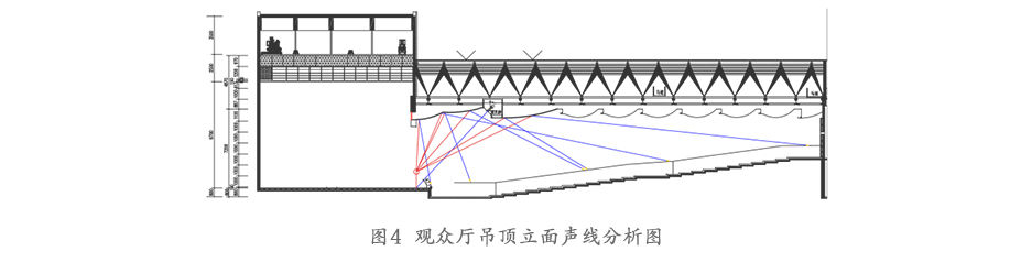 從圖 4可以清楚看到,聲音從舞臺發(fā)出后,經第一段、第二段和第三段吊頂反射,早期反射聲能覆蓋范全部觀眾席區(qū)域,且反射界面體量大。