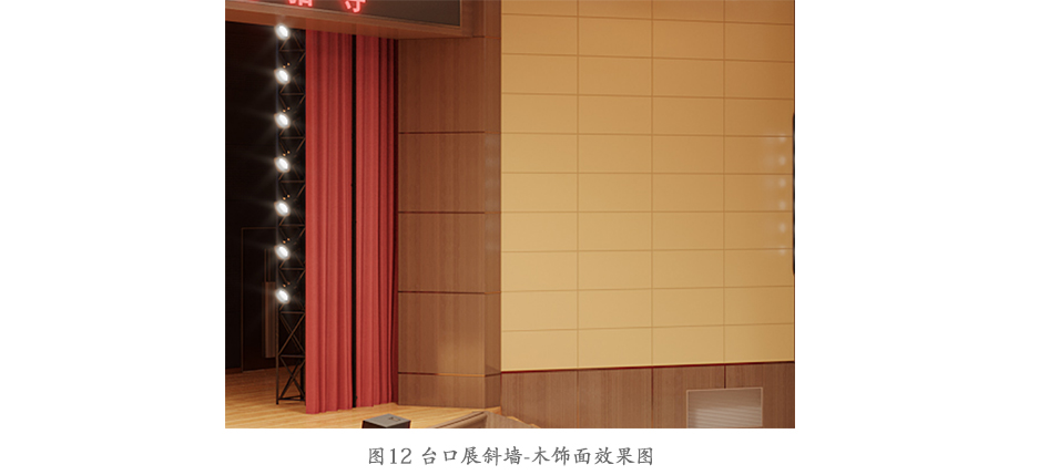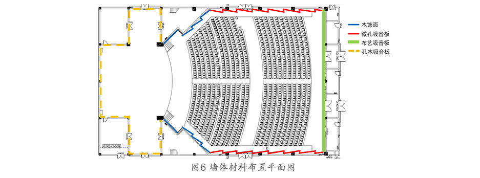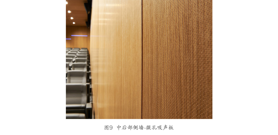 中后部側墻布置微孔吸聲板進行吸聲處理,折線造型能提高聲擴散效果,提高聲場均勻度、語言清晰度,避免產生顫動回聲聲學缺陷;