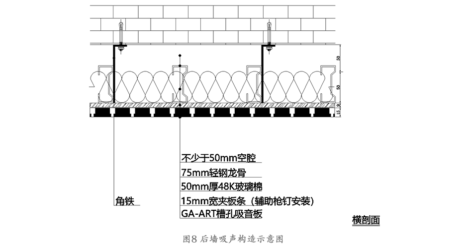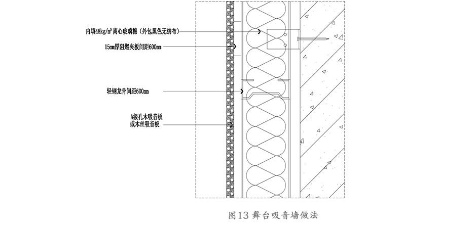 A級孔木吸音板+50 輕鋼龍骨(填 50mm 厚 48k 玻璃棉,外包玻纖布)+建筑墻體,為減少對舞臺燈光的反光,應選用黑色,安裝位置為舞臺墻面一層天橋以下墻面,其他非吸聲墻面刷黑色乳膠漆,其構造及安裝方式如下: