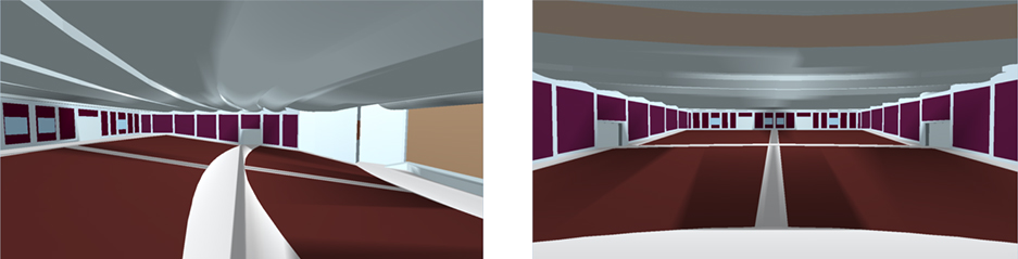 本三維模型對觀眾廳體型作了適當簡化:根據ODEON官方建議,對門窗與墻作同一平面處理,曲面用平面擬合,在保證模擬準確度的基礎上提高音質計算效率。上圖為從舞臺望向觀眾廳后墻方向聲學模型渲染圖,下圖為后部觀眾席區(qū)域望向舞臺口方向聲學模型渲染圖。