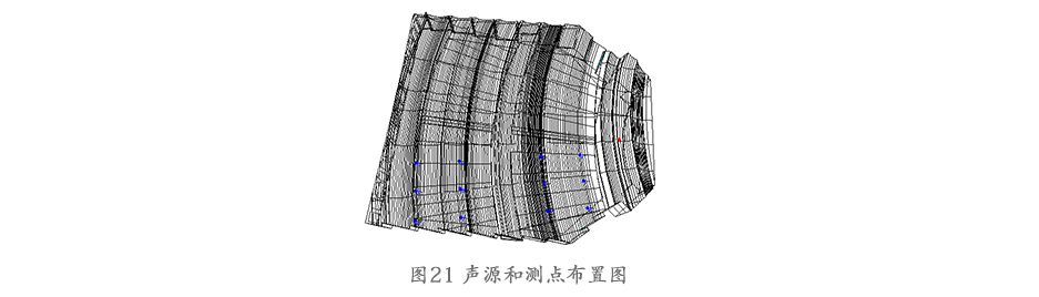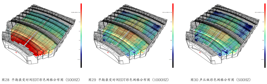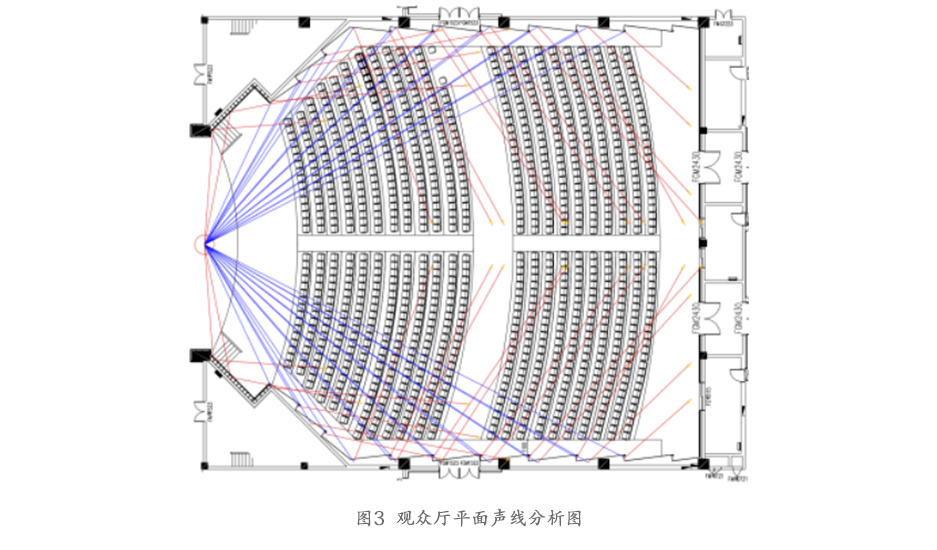 采用計算機聲學模擬試驗,進行聲場分布和早期反射聲測定,主要目的是檢查體形設計中是否存在缺陷和反射聲的分布并以此為依據進行修正。