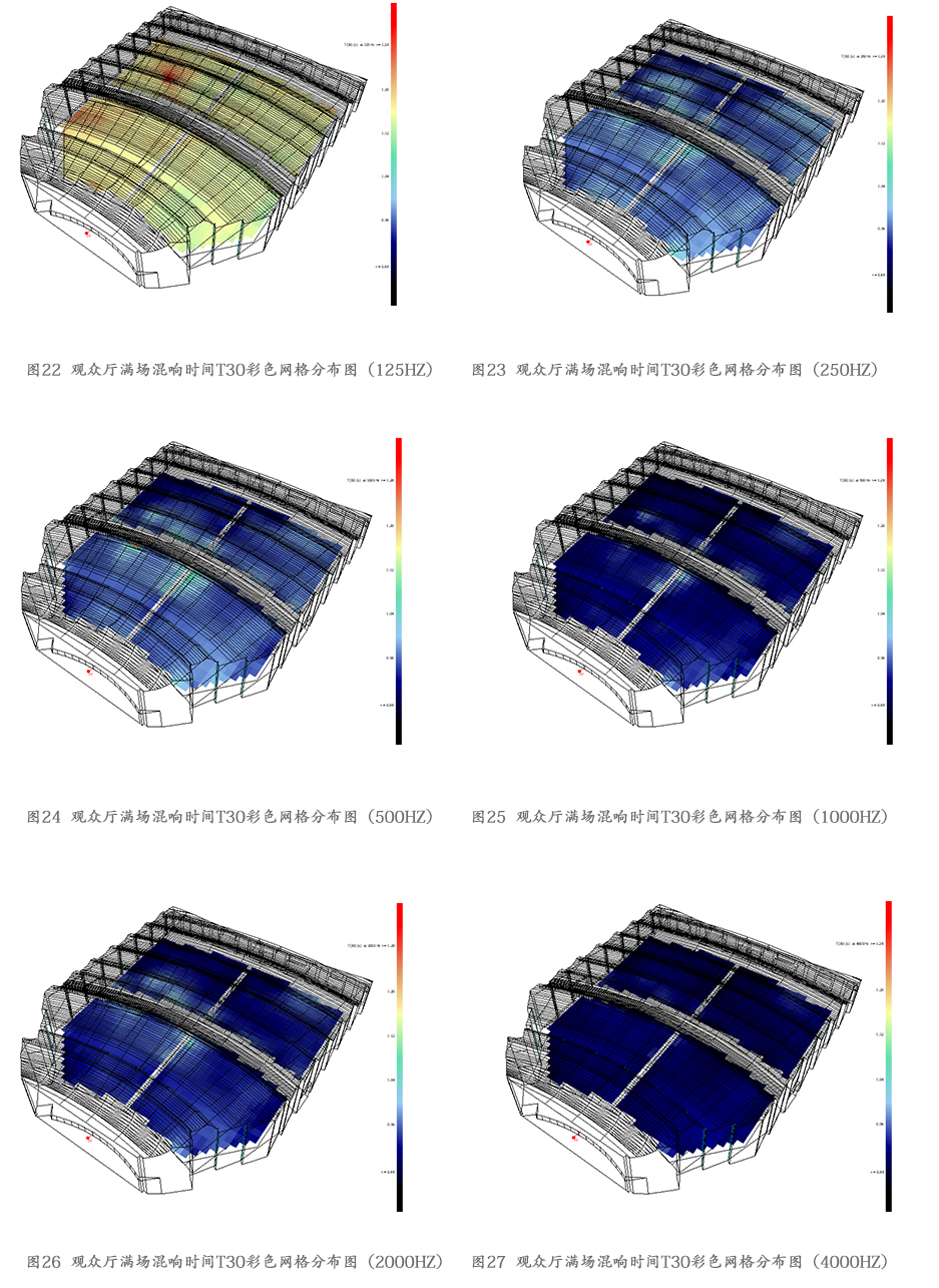 低頻混響時間相對中頻有一定的抬升,低音比BR=1.15>1,保證語音具良好的飽和度、渾厚感;高頻與中頻接近,保證語音具良好的嘹亮感;混響時間的頻率特性平直符合設計要求。據T30 彩色網格分布圖可以看出,混響時間分布比較均勻,最大值和最小值在合理的范圍內。
