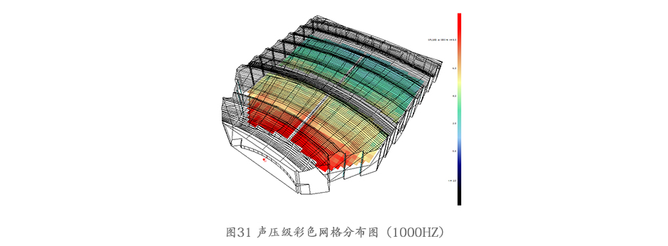 從聲壓級數值彩色網格分布圖可以清楚看出,觀眾廳聲壓變化均勻,不存在突變區(qū)域。