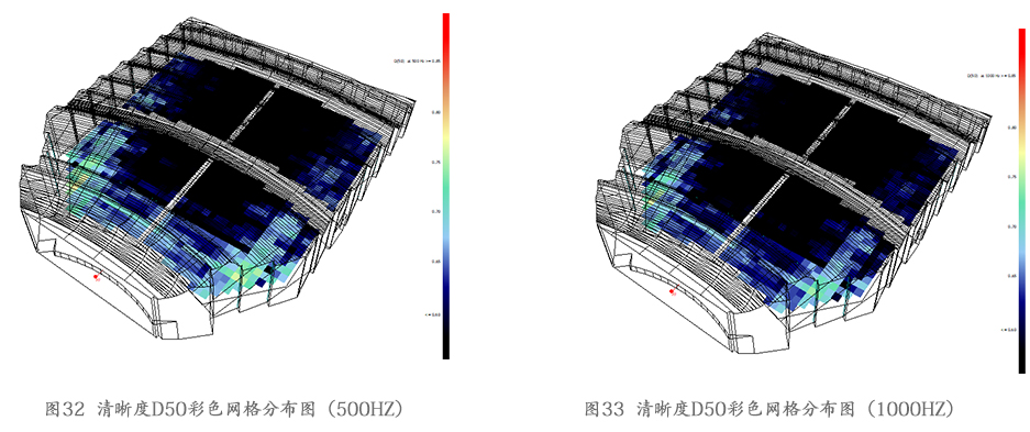 從清晰度D50值彩色網格分布圖可以清楚看出,僅有小部分觀眾區(qū)域(主要集中在觀眾區(qū)中部,面積約10%)D50值略低于0.5。通過合適的電聲系統(tǒng),可進一步提高全場的語言清晰度。