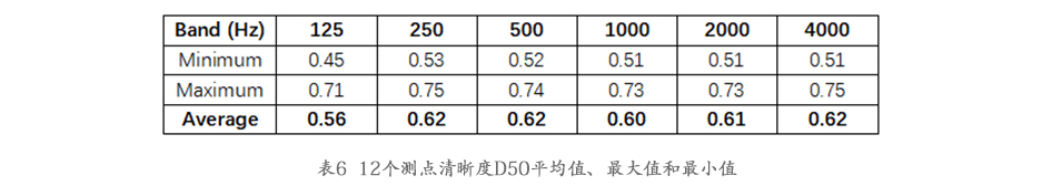 從12個測點的統(tǒng)計值中可以得出,中頻D50平均值為0.61,說明觀眾坐席區(qū)整體具備良好的語言清晰度。