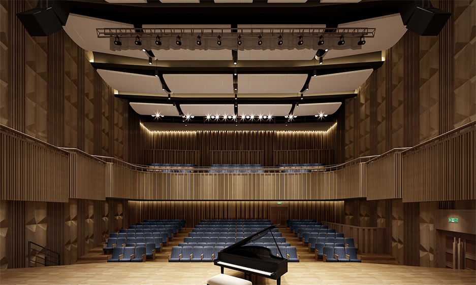 通過增加音樂廳的容積,是增加音樂廳的混響時間最有效根本的做法。因此,將吊頂設計成開放式,吊頂上部的空間屬于整個音樂廳的一部分。開放式吊頂的設計,既能讓廳堂擁有大空間廳堂的混響感,同時能保證小空間廳堂的親切感和空間感。