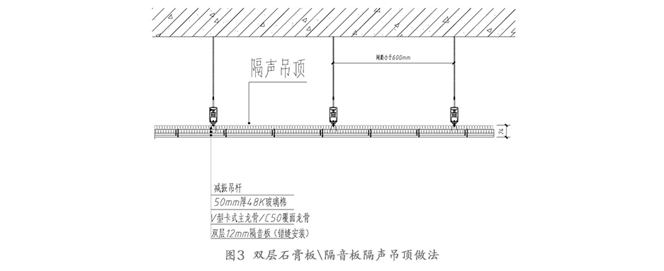 為確保音樂廳上方外圍護構造隔聲量Rw達到60dB,以避免室外噪聲影響音樂廳正常演出,音樂廳廳上方應設置隔聲吊頂(如圖 3),具體構造為:減振吊桿+吊頂龍骨(內填50mm厚48K玻璃棉)+雙層12mm厚防火石膏板,請參見圖 3。