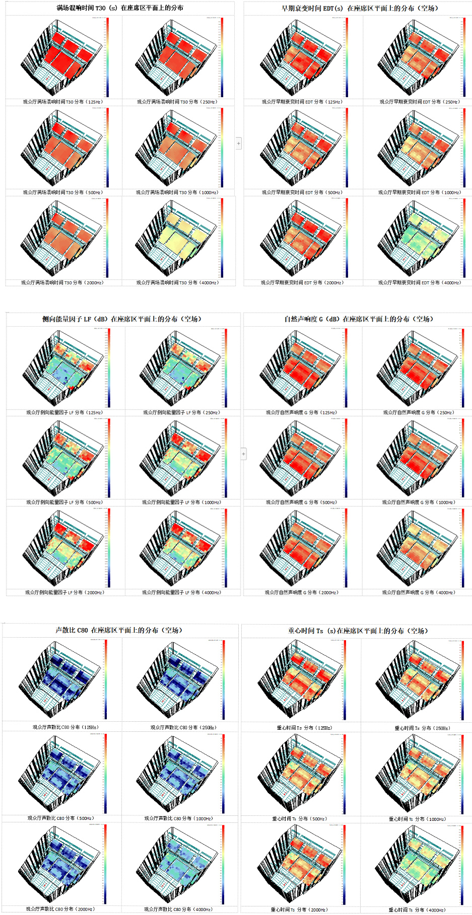 1. 通過對本觀眾廳的室內音質計算機模擬計算結果的分析可知,包括T30、EDT、G、LF、C80、Ts、ST1、BR、IDTD等聲學參量的模擬計算結果均滿足聲學設計目標值。