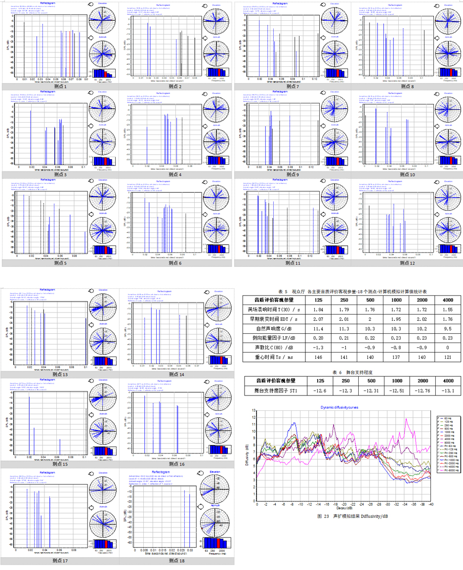 6. 聲場分布,即G值在觀眾區的分布情況:池座第一排與最后一排相差5.3dB,與樓座最后一排相差4dB;中間與兩側聲壓級差為0.5dB,說明對音樂廳設計的擴散措施十分有效,聲場均勻度較高。