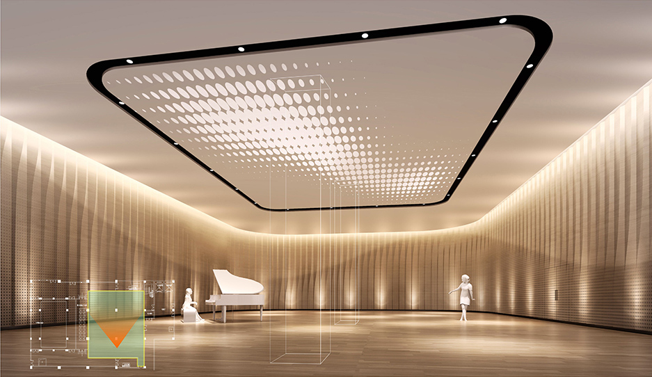 吊頂天花聲學上要求具有較強的反射,同時還要求減少對低頻的吸收,因此可以選用增強纖維石膏板(即GRG 板)吊頂,剛度較好,其板的面密度要求達到40Kg/m2以上,如25mm玻璃纖維增強石膏GRG/玻璃纖維增強混凝土GRC。為增加吊頂的擴散效果,表面可結合裝飾設計,做一些凹凸不平的紋理,有利于防止不良的聲學現象。