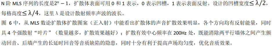舞臺反射界面的擴散設計師非常重要的,從古典音樂廳的雕飾擴散設計,到現代劇場的幾何擴散體以及MLS、QRD擴散體設計得到廣泛的應用。MLS數論擴散體在控制廳堂回聲、防止聲染色和聲聚焦等音質缺陷,以及在控制聲衰變、使聲場擴散提高音質的空間感和清晰度方面均有重要作用,有利于聲場的擴散,有利于音質效果的提高。可使用預制25mmGRG造型,或者厚度大于35mm的實木造型構件。