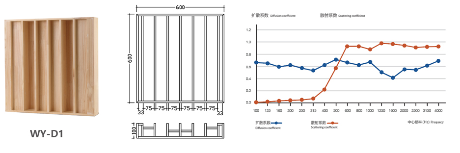 • 聲學特點D1擴散體將入射聲能分散開從而避免回聲和產生駐波。使聲場 更加均勻,改善聲環境,提高聲音的明亮度
