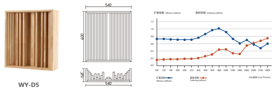 • 聲學特點D5 擴散體還原聲音空間感和提升廳堂的音質顯著。聲學特性 達到國家同類材料標準,配合其他吸聲材料使用能有效地提高 聲音的飽滿度、清晰度以及立體感